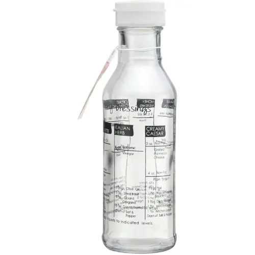 Gemco Glass Salad Dressing Bottle lets you mix, pour, and store your dressings. Six healthy low fat dressing recipes are printed on the bottle. The bottle has an easy-pour plastic locking cap.