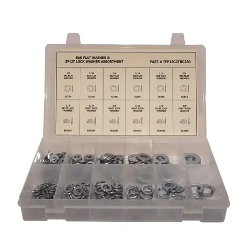 SAE flat washers have slightly smaller inside and outside diameters as compared to USS flat washers. Most SAE washers are made from thinner material. SAE flat washers are designed for assembly around a bolt or screw, between the bearing surface of the fastener and the part to which it is attached. Split lock washers are coiled, hardened, split circular washers with a slightly trapezoidal wire section. The tension generated by the deflection of the regular helical spring lock washer meets the needs of most commercial applications.