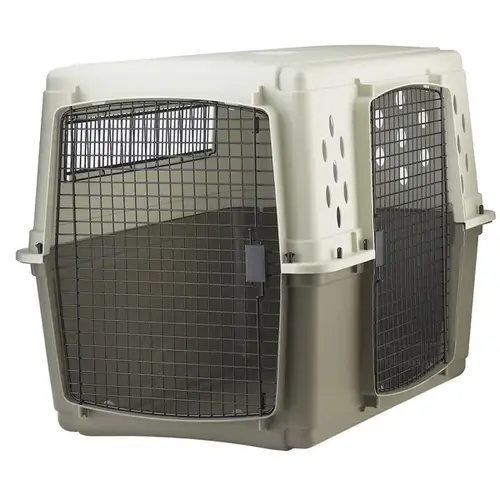 Double door portable plastic pet crates include a second door for added flexibility in use and transport. They feature updated styling and colors and are designed to meet the requirements of the international air transport association (IATA). The easy-to-assemble design includes durable wire doors and vents and rugged HDPE construction, which is strong enough to withstand the rigors of travel and regular use.