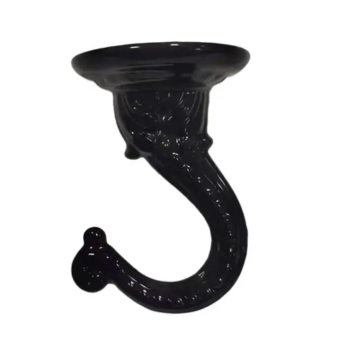 The swag ceiling hook hangs your favorite decorative items from the ceiling. This black hook evokes classical architecture, with a highly adorned base and scrollwork at the top. A rope detailing on the sides adds even more elegance.