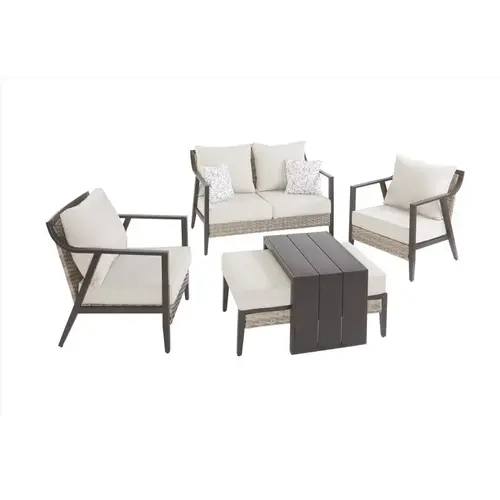 Elevate your outdoor living experience with our exquisite 5 piece patio furniture set. Designed to create a relaxing and stylish atmosphere, offering the perfect combination of comfort and functionality. Constructed with durability in mind, the sturdy steel frames of this patio set are expertly coated with a rust resistant powder finish, ensuring long lasting performance and protection against the elements. The hand woven all weather resin wicker adds a touch of sophistication and elegance to your outdoor space, while also providing exceptional durability. Indulge in the ultimate comfort with polyester fabric cushions, designed to withstand the outdoor elements while providing a cozy seating experience. The stamped woodgrain tabletop of the coffee table adds a rustic and natural aesthetic to your outdoor setting, creating a warm and inviting ambiance. What makes this set truly versatile is the coffee tables unique design, allowing it to be used as a "C" side table, providing additional functionality and convenience. Enhancing the seating options, the 2-seat ottoman features a woven skirt, offering a comfortable and stylish way to kick up your feet and relax. Whether you're hosting a social gathering or enjoying a quiet moment outdoors, our 5 piece patio set promises to elevate your outdoor experience with its exceptional design, durability, and comfort.