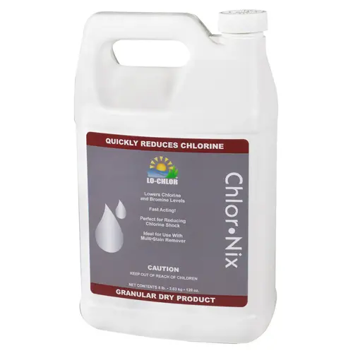 Lo-Chlor Chlor-Nix (CHN008-4) is an 8-lb granular chlorine reducer for pool professionals to quickly lower chlorine and bromine levels in large pools. This sodium thiosulfate formula reduces chlorine by 1 ppm per 2 oz in 15,000 gallons within 30 minutes. Safe for all pool types, it s ideal for bulk treatments and rapid water correction.Compatible with all pool surfaces and saltwater systems, per Lo-Chlor specs.8-lb container, granular form, 2 oz reduces chlorine 1 ppm in 15,000 gal, per documentation.Spread evenly in pool water, no tools required, effective in 30 min per Lo-Chlor guidelines.Ensures fast chlorine adjustment, improving safety and comfort for large pool maintenance.