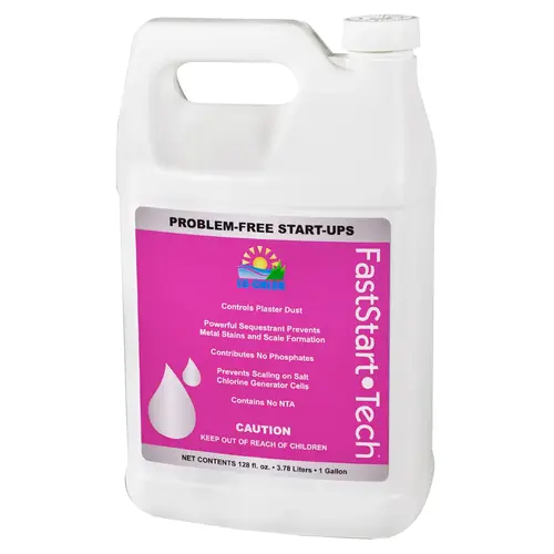 Lo-Chlor FastStart-Tech (FST006-4) is a 1-gallon liquid for pool professionals to safeguard new pool finishes from stains and scale. This phosphate-free sequestrant prevents metal staining, calcium buildup, and plaster dust during startups. Safe for all pool types, it uses 32 oz per 15,000 gallons for clean, durable surfaces.Compatible with all pool surfaces and salt chlorine generators, per Lo-Chlor specs.1-gallon jug, liquid form, 32 oz treats 15,000 gal, per documentation.Add directly to pool water, no tools required, reduces plaster dust in startup, per guidelines.Protects salt cells from scale and prevents stains, ensuring longevity and clear water.