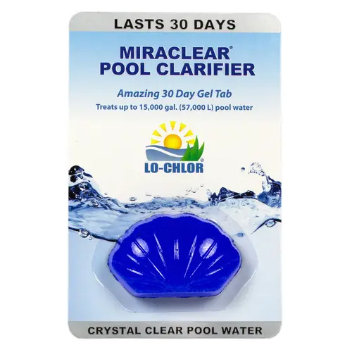 Lo-Chlor Miraclear Gel Tab (LO-3015) is a 1.4 oz clarifier for pool professionals to maintain crystal-clear water for 30 days. This biodegradable gel tablet clears cloudy water and boosts filter efficiency without affecting pool chemistry. Designed for up to 15,000 gallons, it s safe for all pool types and requires no mixing.Compatible with all sanitizers and pool surfaces, including saltwater systems, per Lo-Chlor specs.1.4 oz gel tab, treats up to 15,000 gal, dissolves in 24 hr of pump runtime, per documentation.Place in pump strainer or skimmer basket, no tools needed, works in 24 hr, per guidelines.Enhances water clarity and filter performance, reducing maintenance time and costs.