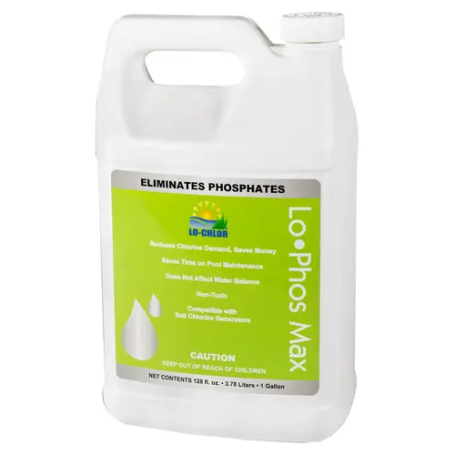 Lo-Chlor Lo-Phos Max (MAX007-4) is a 1-gallon phosphate remover for pool professionals to remove algae-feeding phosphates from pool water. This concentrated liquid lowers up to 2,000 ppb in 10,000 gallons with 4 oz, reducing chlorine demand. Safe for all pool types and sanitizers, it clears water effectively with a clarifier.Compatible with all pool chemicals and surfaces, including salt chlorine generators, per Lo-Chlor specs.1-gallon jug, liquid form, 4 oz removes 2,000 ppb in 10,000 gal, per documentation.Pour evenly into pool, follow with clarifier, run pump 24 hr, per guidelines.Cuts chlorine costs and enhances water clarity, simplifying pool maintenance.