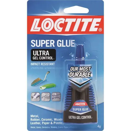 The Loctite Ultra Gel Control 0.14 fl. oz. Super Glue has a rubber-toughened formulation that provides a durable bond. It resists impact, shock and vibration and is ideal for bonds subject to daily use and harsh conditions. It withstands extreme temperature variations and has a self-piercing, no-clog cap that cleans and seals the noz.zle after each use.