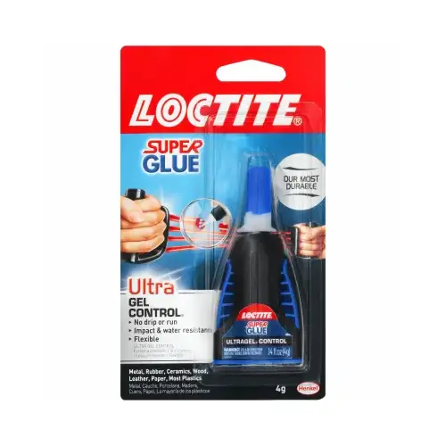 Loctite super glue Ultra Gel Control is a specially formulated rubber toughened instant adhesive that resists impact, shock, vibration and temperature extremes. It is ideal for bonds subject to daily use and harsh conditions. The rubber toughened formula is also outdoor safe and gives more time to align pieces before the glue takes hold. Loctite Super Glue ULTRA Gel Control comes in a patented side-squeeze design for maximum control and air-tight storage. It dries clear and sets without clamping. Loctite Super Glue ULTRA Gel Control is resistant to moisture and freezing temperatures.