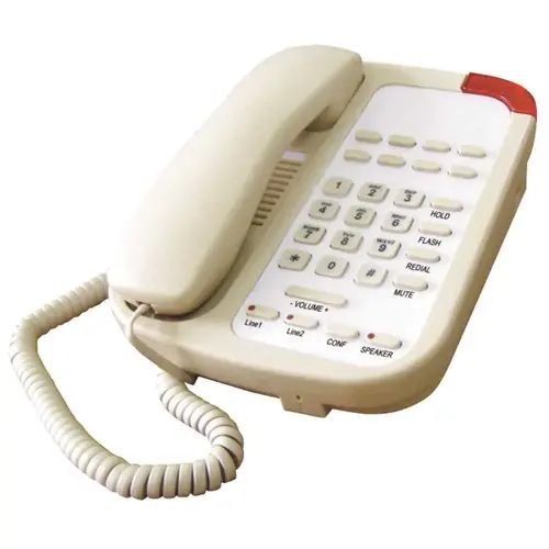 Sleek, multi-function PH-209 series hotel phone with speaker, 9 memory settings, RJ45 jack, and data port. Offers redial, message light, hold, flash, mute, and volume functionality. Perfect for any hotel room, bedroom, or office setting.