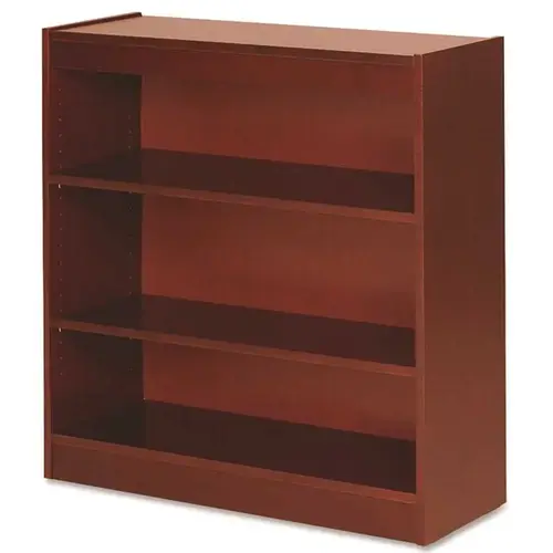 High-quality, veneer bookcase features a vintage square design. Solid, 3/4" thick shelves are adjustable on 1-3/4" centers with pinhole attachments, except for bottom shelf. Three-shelf bookcase has a laminate finish on the back's interior and an unfinished back side. Each shelf holds up to 110 lb.