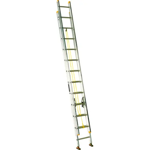 This Louisville 24 ft aluminum extension ladder has a 250 lb load capacity, rated ANSI type I. It is equipped with the maxlock rung lock, custom engineered from a patented, advanced molecular polymer, maxlock is the strongest, toughest, lightest rung lock ever made. This ladder also includes the patented quicklatch runglock system that provides a simple, intuitive method of securing the fly and base sections of the ladder when extended. This ladder also features outside slide guides, D-shape rungs fully serrated for a slip-resistant surface, mar-resistant rail end caps, rope and pulley, modified I-beam for a more stable connection and to prevent twisting and swivel safety shoes to be used as tread down or in-spike position.
