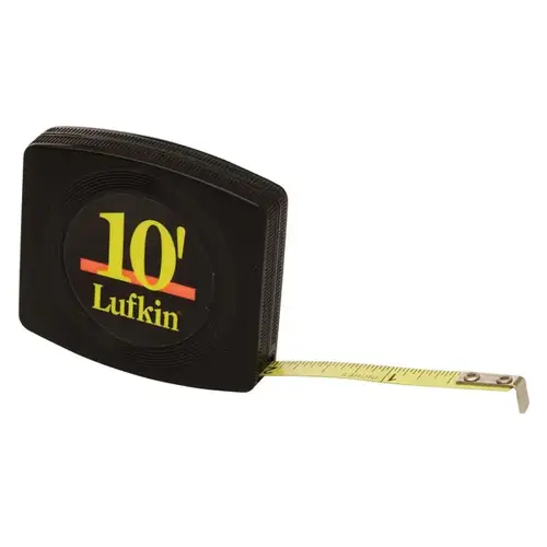 Pocket size ideal for office or home. High-strength black case. Yellow clad blade is flexible with bold graduations on yellow background. Black markings one side only. Consecutive inches to 1/16ths bottom edge, first 12 in to 1/32nds, 16 in centers designated by diamond, every 12th inch in red.