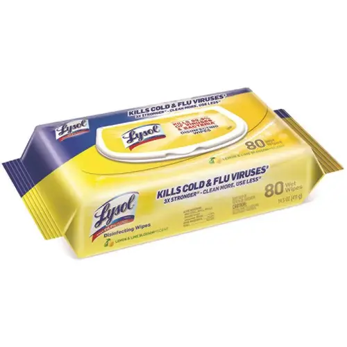 Lysol Disinfecting Wipes, Ready-to-Use, Solid Form, Lemon Like Odor/Scent, White, Compositions: Ethanol, D-Glucopyranose, Oligomeric, C9-11-alkyl Glycosides, Quaternary Ammonium Compounds, Benzyl-C12-16-Alkyldimethyl, Chlorides, 1 Specific Gravity, >199.9 deg F Flash Point, 9.9 to 11 pH, 8-1/2 in Length, 6-3/4 in Width, Includes: (80) Disinfecting Wipes