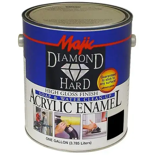 DESCRIPTION: This is truly one of the finest quality general purpose coatings available today. Diamondhard Acrylic Enamel features superior adhesion to almost any interior or exterior surface with a resilient durable finish that lasts for years. This is a water base formula that offers added convenience and safety in a product that will out perform conventional oil base paints in most situations. SURFACE PREP: General: Surfaces to be painted must be clean, free of dirt, chalk, grease, loose paint and all other residue or contaminants. Scrape, wire brush and sand to remove loose or unsound paint layers. Clean the surface by washing with a low sudsing detergent and water. Remove mildew by washing with a solution of household bleach and water (1:3). Rinse thoroughly. Allow surfaces treated with bleach solution to dry at least 48 hours before painting. Stains from ink, smoke, water and grease should be sealed with a good stain killing primer. Wood: This product can be applied directly to wood. But for best appearance, use an oil base enamel under coater or acrylic primer before applying the finish coat(s). Metal: Clean new metals with a solvent such as mineral spirits to remove grease and oily residue. Allow solvent cleaned surfaces to dry completely. Remove all rust by wire brushing, sanding or chemical treatment. On ferrous metals subject to corrosive conditions or where rust has been a recurring problem, use a rust inhibiting primer. No primer is required for aluminum. Masonry, Brick & Concrete, Drywall and Other Surfaces: This coating will adhere to a wide variety of other surfaces. If you are painting a difficult or unusual surface, first paint a small area, allow to cure for 5 days, and test for adhesion by apply masking tape to the surface then removing the tape in a quick upward motion. If the finish does not lift, you have a suitable surface for painting. See label for additional details. APPLICATION: Do not apply at temperatures below 50+ALA-F. Avoid painting in direct sunlight or during unusually hot or windy conditions. Do not paint exterior surfaces at night or during damp or rainy weather. Apply this product with a good quality polyester brush or premium short nap (3/16 -1/4 ) roller. Apply a full even coat, brushing out to avoid runs and sags. This product provides superior leveling which will eliminate brush marks as it dries. Avoid over brushing after the paint has begun to dry or tack. If you must stop painting before finishing your project, stop at a corner, edge or other breakpoint, rather than the middle of a surface. If applying with airless spray equipment, apply at package consistency, unthinned. A .013-.015 tip at 1,200-1,800 PSI is recommended. For conventional spray, thin sparingly with clean water up to one pint per gallon. If applying more than one can of product, intermix or box the paint together to ensure maximum color uniformity.