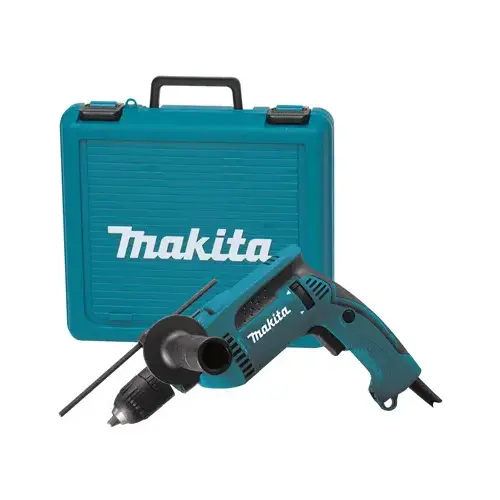 The Makita 5/8 in hammer drill deliver versatility and longer runtime to the jobsite. The HP1641K offers two-mode operation (rotation only or hammering with rotation) for multiple applications. The HP1641K is powered by a 6 A variable speed motor for the most demanding applications. Capacities include 5/8 in concrete, 1/2 in steel and 1-3/16 in wood, with a full 0 to 44,800 bpm. The HP1641K weighs only 4.3 lb with a soft-grip handle and recessed lock-on button for continuous use.