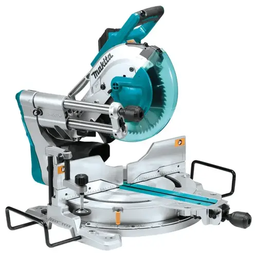 The Makita 10 in dual-bevel sliding compound miter saw with laser (model LS1019L) combines capacity, accuracy and efficient dust extraction in a more compact size, with a unique two-steel rail sliding system that offers a reduced footprint for operation flush against a wall. The innovative direct-drive gearbox and guard system is engineered for increased vertical cutting capacity of baseboard (5-1/4 in) and crown molding (6-5/8 in nested), the largest in its class. It will also crosscut a 4 x 12 at 90 deg. The saw is powered by a 15 A direct drive motor with soft start, a key point of difference. Direct drive enables smoother start-ups and consistent, constant power with no belts to slip or replace. The electric brake provides added convenience. In addition, the electronic speed control maintains constant speed under load for smoother, higher-quality cutting. For improved dust extraction it has an improved dust collection capability for use with a bag (included) or vacuum (sold separately). It also has a large-sized aluminum base that improves the stability of cutting stock for more efficient cutting.