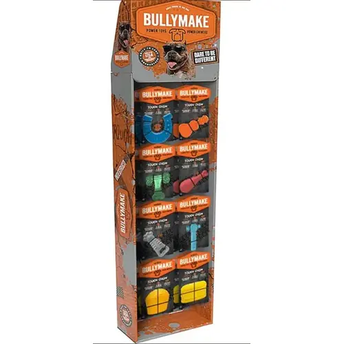 BULLYMAKE designs, creates, and manufactures the tough toys for power chewing dogs - all backed by our exclusive guarantee. BULLYMAKE also makes all-natural, healthy treats for your dog. All treats are grain free and made in the USA. Contains: 22 Piece Display 2 ea TOSS N TREAT Gold Popcorn/ Flavor: Butter 2 ea TOSS N TREAT Yellow Cheeseburger/ Flavor: Bacon 3 ea TOUGH CHEW Bone Green/ Flavor: Mint 3 ea TOUGH CHEW Paw Opener Silver/ Flavor: Chicken 3 ea TOUGH CHEW Horseshoe Blue/ Flavor: Bacon 3 ea TOUGH CHEW Ukulele Orange/ Flavor: Peanut Butter 3 ea TOUGH CHEW Turkey Leg Red/ Flavor: Turkey 3 ea TOUGH CHEW Hammer Icy Blue/ Flavor: Beef