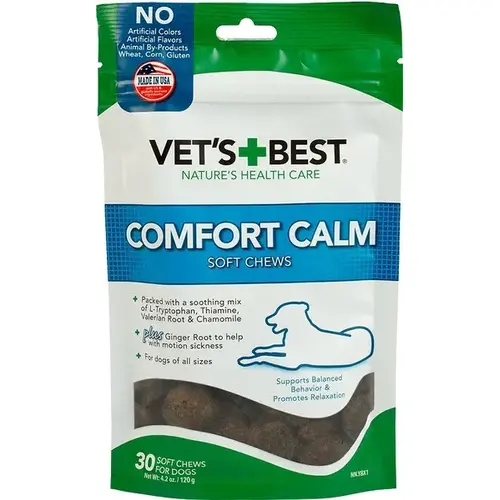 Vet's Best Comfort Calm Soft Chews Dog Supplement is a dog calming aid to help reduce the effects of normal environmental stress and promote relaxation and balanced behavior for dogs exhibiting nervousness, hyperactivity or discontentment. These once-a-day soft chew supplements are perfect for dogs who experience stress during travel, thunderstorms, separation anxiety, boarding and grooming. They contain a carefully formulated blend of tryptophan, thiamine, valerian root and chamomile to support balanced behavior and non-drowsy relaxation, and to help to reduce separation anxiety. Ginger root is added to manage and ease motion sickness related to travel. These chews contain natural ocean kelp which provides antioxidants to help reduce the effects of normal environmental stress and to help support a healthy immune system along with prebiotics for digestion and ingredient uptake. Vet's Best Comfort Calm Soft Chews are extra moist, made with vet-quality natural ingredients, great tasting and have efficacious formulations with a high level of bioavailability for optimal absorption.