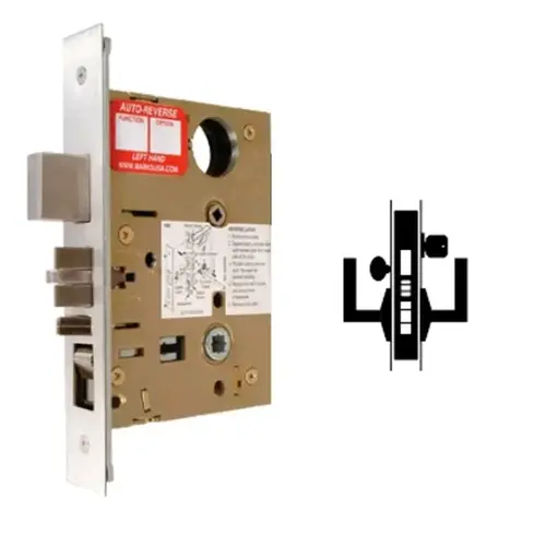 Latch bolt by knobs/levers except when outside knob/lever is made inoperative by buttons in face. Dead bolt by key outside and turn inside. Rotating inside knob/lever retracts both bolts. Deadlocking latch.