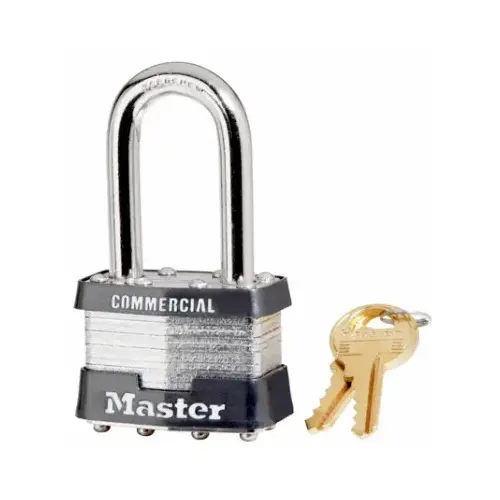 Precision cylinder protection, thousands of key changes, tough, laminated, cadmium rustproof steel case; nickel shackle. Removable key- change number for added security. Pair of brass keys included with every lock. Case-hardened steel shackle. Exclusive dual steel locking levers independently lock each shackle leg for increased protection. Patented taper assures smooth vertical shackle movement and precise engagement of locking levers. Proprietary rustproofing for longer life. 1-3/4 in wide case, 5/16 in Dia shackle and 3/4 in wide horizontal shackle clearance.