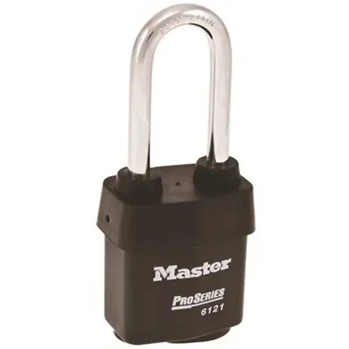 The Master Lock Number 6121KALJ ProSeries Weather Tough Covered Laminated Padlock, Keyed Alike - multiple locks open with the same key - features a 54 mm W heavy steel body to withstand physical attack and a 63 mm H, 8 mm Dia hardened boron alloy shackle for superior cut resistance. The exclusive cover protects this padlock from harsh elements and a high security, rekey able 5-pin cylinder with spool pins is virtually impossible to pick. The Limited Lifetime Warranty provides peace of mind from a brand you can trust.
