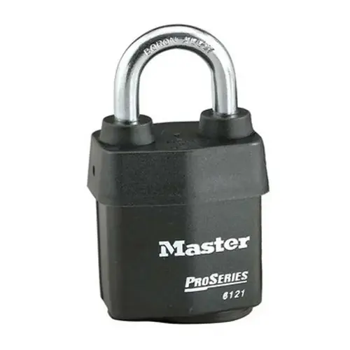 The Master Lock No. 6121KA ProSeries® Weather Tough® Covered Laminated Padlock, Keyed Alike – multiple locks open with the same key – features a 2-1/8in (54mm) wide heavy steel body to withstand physical attack and a 1-1/8in (29mm) tall, 5/16in (8mm) diameter hardened boron alloy shackle for superior cut resistance. The exclusive cover protects this padlock from harsh elements and a high security, rekeyable 5-pin cylinder with spool pins is virtually impossible to pick.