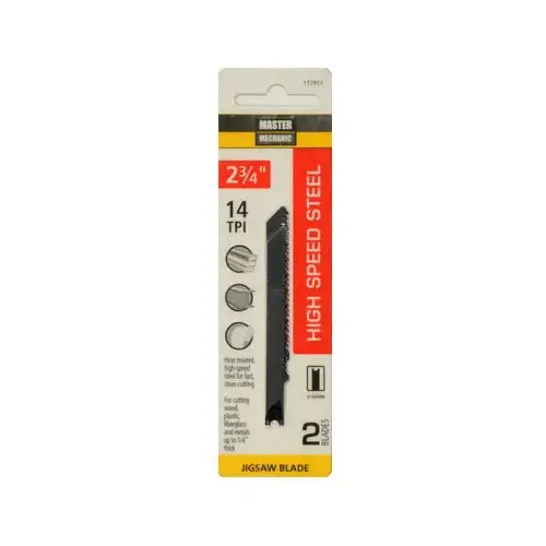 Master Mechanic, 2 Pack, 2-3/4" x 14 Tooth, Metal Cutting, High Speed Steel, Jig Saw Blade, 1/4" Universal Shank, Designed To Cut Through Wood, Plastic, Fiberglass & Metals Up To 1/4" Thick, Carded.