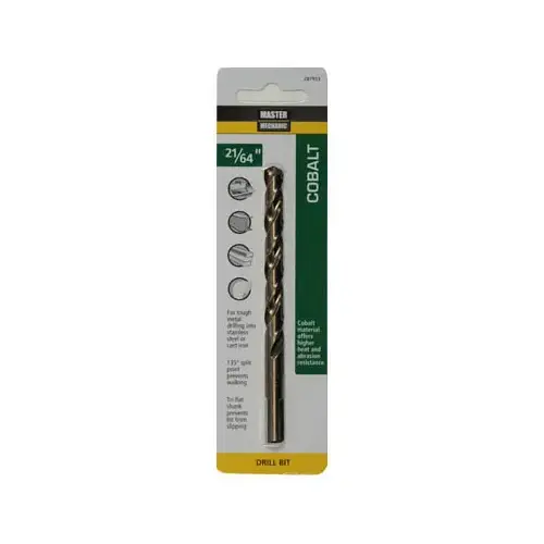 Master Mechanic, 21/64" x 4-5/8", High Speed Steel With Cobalt Drill Bit, 135 Split Point, Jobber Length, Straight Shank, 135 Split Point Design With 4 Cutting Edges Allows Quick Penetration & Eliminates Walking, 8 Percent Cobalt Content Provides Heat Resistance & Delivers Maximum Cutting Efficiency At Temperatures In Excess Of 1,000 Degrees Fahrenheit, Recommended For Drilling In Hard Metals Such As Heat Treated Steel, Stainless Steel, Chrome, Manganese Steel Plus Titanium & Armor Plate, Carded.