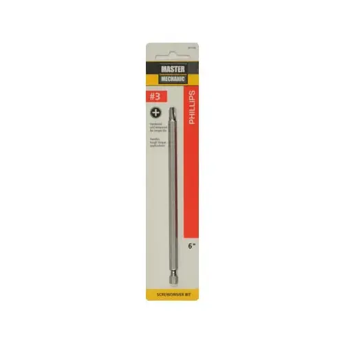 Master Mechanic, #3 Phillips 6" Screwdriver Bit, Extra Long Bit For Driving Screws In Tight Corners Or In Cramped Spaces Where Tool Will Not Fit.