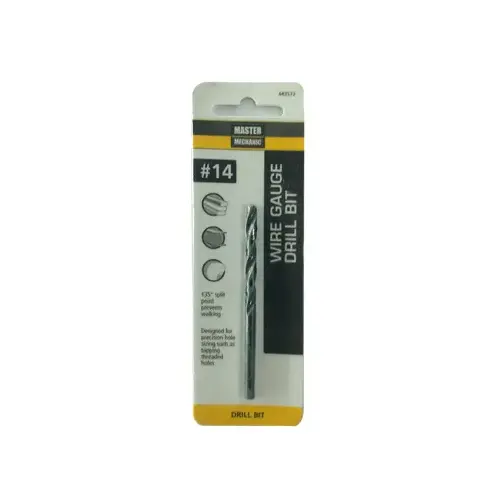 Master Mechanic, #14, 3-3/8", M7, Black Oxide, Wire Gauge Number Drill Bit, Jobber Length, Straight Shank, 135 Split Point Eliminates Walking & Provides Quick Starting, Surface Treated With Black Oxide Finish For Abrasion Resistance & Improved Chip Flow, Designed For Precision Hole Sizing Such As Tapping Threaded Holes, Wire Gauge Diameters Fall Between Fractional Sizes For Most Precise Hole Sizes, Taps Through Sizes 1/4-28 Require The Use Of Wire Gauge Bits, Carded.