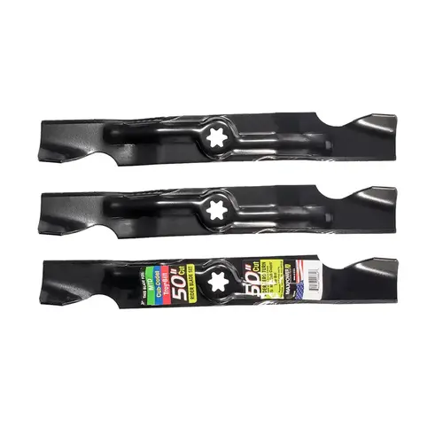 MaxPower's 561545 includes 3 blades for many 50 in. cut MTD, Cub Cadet, Troy-Bilt mowers. These blades replaces OEM #: MTD, Cub Cadet, Troy-bilt742-04053a, 742-04053b, 742-04053c, 742-04056, 742-04056a, 742-04056b, 742-04056c, 942-04053a, 942-04053b, 942-04053c, 942-04056, 942-04056a, 942-04056c, Toro 112-0316, Windsor 50-2138. Each blade measures 17-29/32 in. L and 2-1/2 in. W with a 6 point star center hole. Check your owner's manual to verify that the OEM number of the blade being replaced matches one of the OEM numbers provided for this item. Maxpower blades are manufactured to meet or exceed OEM specifications. Proudly made in the USA.