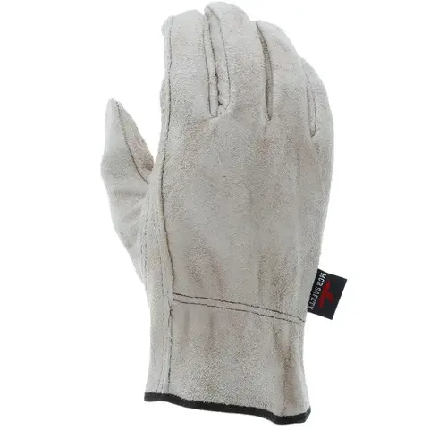 Brown Unlined Split Cowhide Leather. Color Coded Hem to Identify Sizes. Keystone Thumb. Formerly Known as Memphis Glove