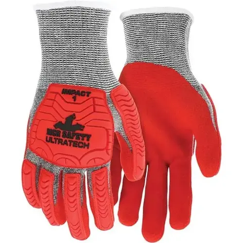 13-Gauge Salt & Pepper Hypermax® Cut-Resistant Shell. Abrasion And Puncture-Resistant. Back Of Hand TPR Provides Level 1 Impact Protection. Designed To Absorb And Bite Down For Gripping Power. Excellent Impact Protection And Dexterity. Red Sandy Foam Nitr