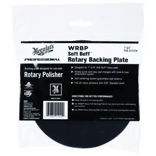 Meguiar’s rotary soft backing plate is designed to be used with our 7" & 8" Soft Buffrotary pads. The soft one-piece molded construction safely contours to curves and body lines resulting in a more forgiving polishing experience with less swirl marks.