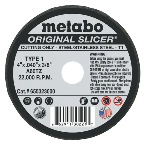Metabo 55323 Original Slicer Cutting Wheel, 4 in dia, .04 in Thick, A 60 TZ Grit, Alum. Oxide Black
