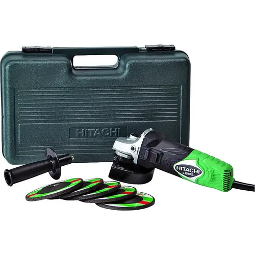 The 4-1/2 in angle grinder (G12SR4) offers a smaller grip diameter which contributes to easier control and less fatigue with continuous use, increased performance with a higher power input of 6.2 A and higher overload durability. The powerful 6.2 A motor on this grinder delivers great performance on tough jobs. The new motor design creates better cooling efficiency and ensures high motor durability. The grinder also has a spindle lock for easy wheel changes and includes five angle grinding discs. This angle grinder is ready to work out of the box.