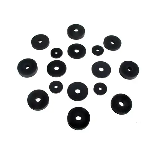 Experience unparalleled durability and performance with the RP 80-B Heavy Duty Insulator Rubber Washers by Metro Moulded Parts. Designed for precision, these washers are commonly known as bumper grommets, rubber spacers, cushioning washers, and protective discs. This 16-piece set features eight washers measuring 1-1/2" O.D. by 3/8" I.D., with varying thicknesses of 3/8" and 1/4", plus four washers at 1" O.D. by 1/4" I.D. thick. Born from 50 tons of pressure for exceptional detail, they boast smooth edges and flawless surfaces. The superior form of these rubber washers ensures sound insulation while reducing vibrations an essential feature for protecting equipment. Their grooved surfaces guarantee a steadfast grip, making them straightforward to install. Simply slide them into position, relying on their firm hold to keep everything secure. Infused with a sleek, black finish, these durable washers are the epitome of reliability and longevity. Trust your next project to RP 80-B, and purchase with confidence backed by Metro s platinum 30-year warranty. Your satisfaction is not just a promise; it s a guarantee!