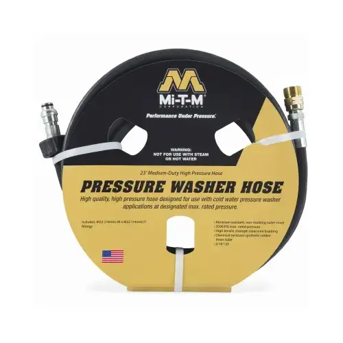 High quality, high pressure hose designed to use with cold water pressure washer applications at designated max. rated pressure. Abrasion resistant, non marking outer cover. 3500 psi max. rated pressure. High tensile strength steel wire braiding. Inner tube composed of chemical resistant synthetic rubber. Includes M22 x 14 mm male and female screw connects.