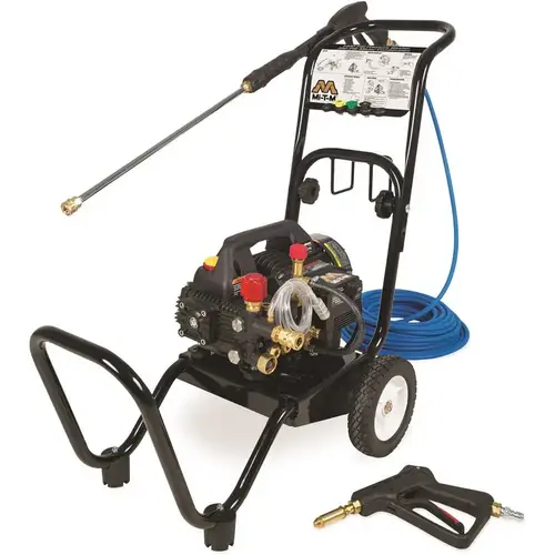 Mi-T-M 1,400 PSI Electric Pressure Washer/Mister Combination With Cart. Use As Either A Traditional Pressure Washer Or Disinfecting Mister. 1.5 Gpm With 120 Volt Industrial Duty Motor. 1400 Psi Pressure Washer And 350 Psi Mister Combination. 75 Ft. X 3/8 In. Wire Braided Non-Marking Hose. 35 Ft. Power Cord With Gfci Protection. Nema 5-15p, 15 Amp Plug Type. Includes 15 Degree, 25 Degree, And Detergent Nozzle; Two-Piece 36 In. Lance; Professional-Grade Trigger Gun, And Trigger Gun With Misting Nozzle. Recommended For Up To 10 Hours Use Per Week. 1-Year Limited Warranty. Mfg #CM-1400-0MEC-M