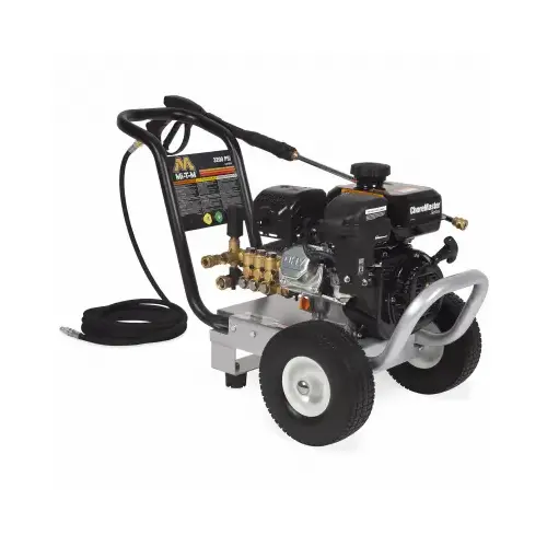 Direct drive axial pump on Sku# 298.7766 and direct drive crankshaft pump on Sku#548.2690. Stainless-steel and brass unloader. Built-in low pressure detergent injection. Fixed pressure. Thermal relief valve pump protection. In-line water strainer. Mi-T-M Series engine with low oil shutdown. 1 in powder-coated steel tube handle for easier handling. Solid steel axle. Dual rubber isolators. Powder-coated steel base plate. Quick release gun/wand holder and hose wrap. Includes quick connect nozzles (15 deg and 25 deg and detergent nozzle), 25 ft x 3/8 in wire braided pressure hose, professional-grade insulated trigger gun with safety lock-off and 36 in lance. Carb compliant.