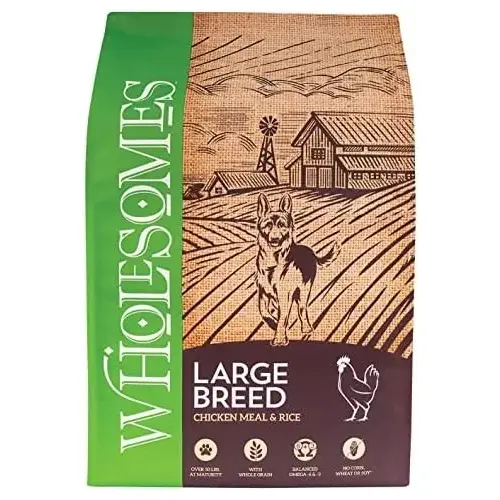 Wholesomes Large Breed Chicken Meal & Rice is designed for dogs that will weigh over 50 lbs. at maturity. Large Breed is made without high-water, low-protein meats and common grains like corn, wheat or soy. Large Breed nutritionally balances Omega-6 & Omega-3 fatty acids to promote healthy skin and hair coat. Fortified with Glucosamine and Chondroitin Sulfate, Large Breed helps maintain healthy joints. Large Breed supplies your dog with a 100% complete and balanced diet for a healthy active life.