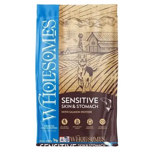 Just like people, some dogs can struggle with digestive health. An easy fix could be a simple switch of food. Wholesomes Sensitive Skin & Stomach with Salmon Protein was formulated with care to help your dog stay on a positive course of health throughout all stages of life. Packed with easily digestible proteins and quality sources of fiber, this salmon dog food for sensitive stomach and skin will support any puppy or adult dog?s dietary needs. Ingredients: Salmon Meal (Natural Source of Glucosamine and Chondroitin), Brown Rice, Oatmeal, Pearled Barley, Whitefish Meal (Natural Source of Glucosamine and Chondroitin), Ground Rice, Rice Bran, Canola Oil (Preserved with Mixed Tocopherols), Beet Pulp, Dried Yeast, Flaxseed, Natural Flavor, Dicalcium Phosphate, L-Threonine, Salt, Potassium Chloride, Choline Chloride, Taurine, Vitamins (Vitamin E Supplement, Niacin, Calcium Pantothenate, Vitamin A Supplement, Riboflavin Supplement, Thiamine Mononitrate, Pyridoxine Hydrochloride, Biotin, Vitamin B12 Supplement, Vitamin D3 Supplement, Folic Acid), Minerals (Zinc Sulfate, Ferrous Sulfate, Copper Sulfate, Manganese Sulfate, Zinc Proteinate, Copper Proteinate, Manganese Proteinate, Sodium Selenite, Calcium Iodate, Cobalt Carbonate), Rosemary Extract