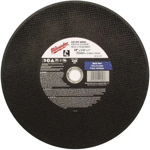 The Milwaukee 49-94-1415 is a 14 in. x 3/32 in. x 1 in. Cut-Off Wheel (Type 1). Milwaukee's comprehensive offering of grinding and cutting wheels consists of 45 unique products ranging in diameters from 4-1/2 in. to 14 in., with arbor configurations of 7/8 in., 20 mm, 1 in. and 5/8 in.-11. Milwaukee's abrasive offering is manufactured using three types of abrasive grains, Aluminum Oxide, Silicon Carbide, and Zirconia Alumina, providing products for general purpose to specialized high performance applications.
