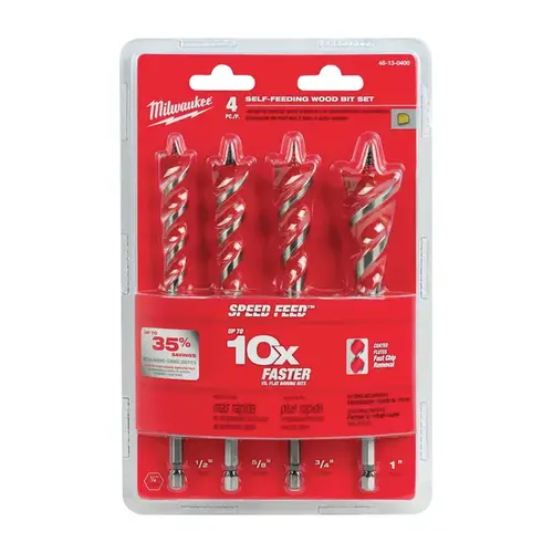 The Milwaukee 4-Piece x 6 in SPEED FEED wood bit set lets you drill up to 10X faster than flat boring bits. These self-feeding wood bits feature double-wing spurs for drilling fast holes in clean wood. The feed screw and dual cutting edges permit fast cutting of clean holes that are ideal for feeding wire or bolts. The set includes 1/2 in, 5/8 in, 3/4 in and 1 in SPEED FEED wood bits in a roll-up pouch with room for extra bits.