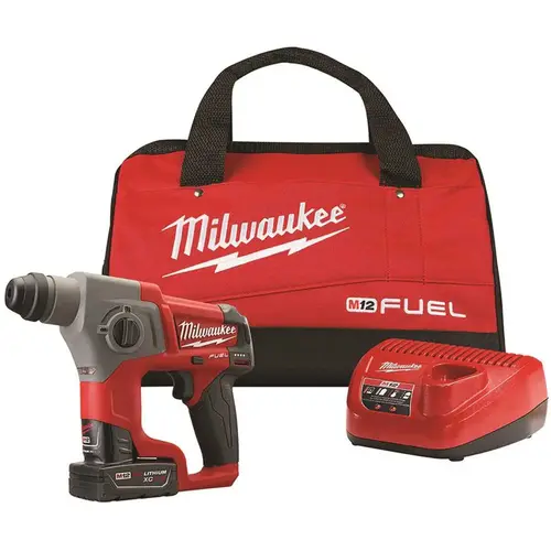 The Milwaukee M12 FUEL 5/8 in. SDS Plus Rotary Hammer Kit provides up to 75% faster drilling, up to 70% less vibration and up to 2X more runtime and the largest SDS Plus bit capacity in its class. Milwaukee has combined its exclusive POWERSTATE Brushless Motor, REDLITHIUM Battery Pack and REDLINK PLUS Intelligence to deliver users optimized performance, overload protection and superior pack construction. The electro-pneumatic design allows for drilling of up to 5/8 in. holes in concrete and masonry. At only 10 in. L and 3.9 lbs., this tool provides performance and runtime that is comparable to a much larger tool, at a fraction of the size and weight. The rotary hammer also features 2-mode operation, rotary hammer and rotation only for maximum versatility, regardless of application or orientation. In addition to the rotary hammer, this kit includes one M12 REDLITHIUM XC 4.0 Extended-Capacity Battery Packs, one M12 Charger and a plastic carrying case.