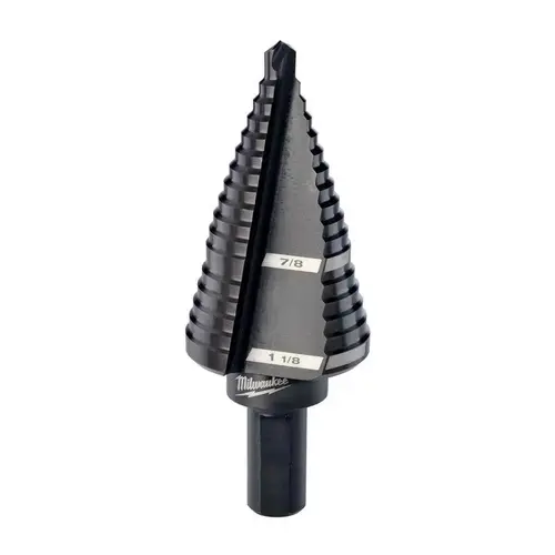Our line of step drill bits far surpasses the competition. With our single cutting edge design, you will have more control and a cleaner finish. Made of high-speed steel, these new step drill bits are durable and designed to drill through most metals. The black oxide finish prevents corrosion and has great capacity to work with drilling lubricants. The new speed start tip prevents bit walking and allows faster penetration. With laser etched markings you will always know your hole sizes...no guess work! Finally, the 1/4 in hex shank allows for fast bit change in impact drivers and sure grip in chucks.