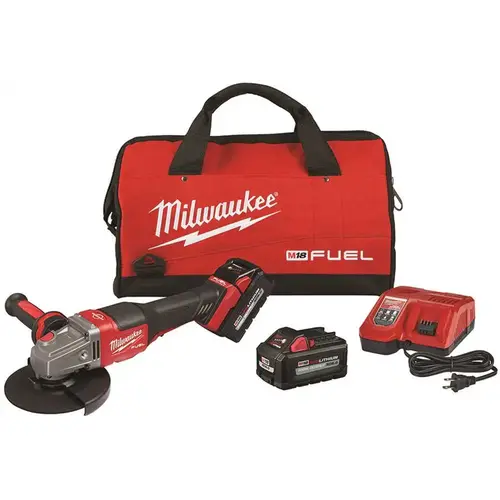 Milwaukee M18 FUEL 4-1/2 in. to 6 in. Braking Grinder, Paddle Switch, No-Lock 2 battery kit. It generates the power of a 13 Amp corded grinder, has 6 in. grinding capacity and brakes all accessories under 3 seconds. REDLINK PLUS intelligence protects the grinder from overloading, overheating and over discharge. The M18 REDLITHIUM HIGH OUTPUT XC6.0 Battery delivers more material removed per charge and exceptional run time. FIXTEC nut and tool-free guard adjustments mean less downtime as you work. The grinding wheel is sold separately.