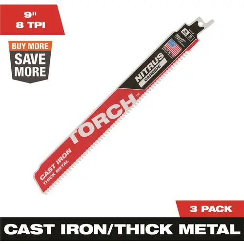 The Milwaukee 9 in.- 7 TPI The TORCH with NITRUS CARBIDE for CAST IRON and other thick metals is the next generation of carbide teeth technology. This SAWZALL blade with NITRUS CARBIDE teeth cuts longer, cuts more and cuts faster than traditional carbide teeth products on the market. Milwaukee NITRUS CARBIDE technology eliminates the tradeoff between life and speed of cut compared to traditional carbide teeth blades. The blade delivers 3X the life of existing carbide teeth reciprocating saw blades to continuously make the toughest cast iron removals on the job. With 25% more Nitrus Carbide per tooth and a universal tang, The TORCH SAWZALL blade with NITRUS CARBIDE cuts the thickest metals like cast iron and soil pipe. With a unique carbide blend, it also outperforms standard carbide teeth blades in common thick metals.