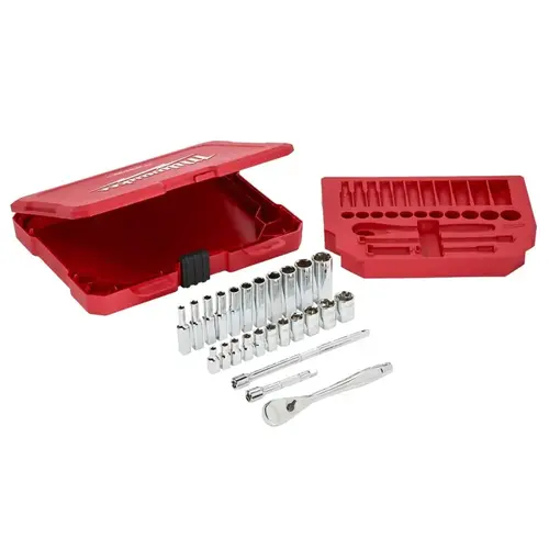 Our Milwaukee SAE 26 pieces 1/4 in drive ratchet and socket set is designed from the ground up, offering our users the most versatile sockets that are anti-roll and wrench-ready. Its innovative FOUR FLAT sides feature an anti-roll and wrench-ready design. The 90 tooth ratchet tool offers 4 deg of arc swing and a slim profile design, allowing you to work in tighter and more confined spaces, be it under the hood of a car or in the middle of a remodel. The ratchet and socket kit comes with a removable inner tray which is perfectly designed to be stored long term in a steel storage chest. All of our sockets are stamped with SAE measurements on the flat side for easy-to-read visibility. It also comes with a durable carrying case for ultimate portability. The set comes with accessories included so that our users can get every job done, both in the garage and on the jobsite. Our ratchet and socket set is backed by our lifetime guarantee.