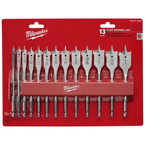 Includes: 1 in 1/2 in 1/4 in 11/16 in 13/16 in 13/16 in 3/4 in 3/8 in 5/16 in 5/8 in 7/16 in 7/8 in and 9/16 in Flat Boring Bits