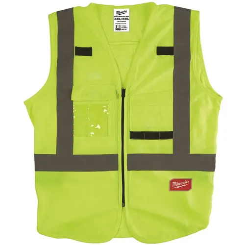 The Milwaukee 4XL/5XL Yellow ANSI Type R Class 2 High Visibility Safety Vest is designed to carry more. The high visibility safety vest has 10 pockets, including a clear ID holder and an internal pocket for additional storage. This yellow safety vest with pockets features a quick internal size adjustment, providing users with a better fit and a durable pass-through slit for fall protection gear. The size adjustment allows users to wear the Milwaukee safety vest in the summer over a t-shirt or in the winter over a jacket. The zipper closure on these high visibility safety vests delivers users ultimate jobsite security. Class 2 high visibility reflective safety vests are recommended when working in environments with traffic traveling under 50 mph or when working around heavy machinery. This includes construction, road construction, traffic direction, utility crews, and survey crews.